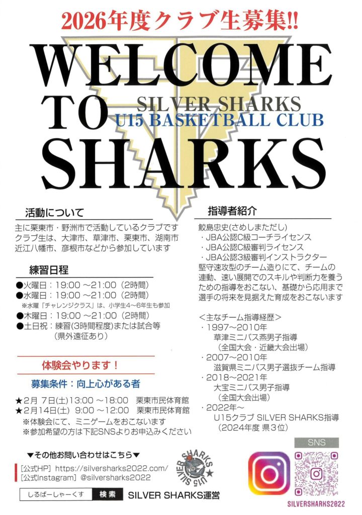 2024年11月4日・16日・17日 能登川アリーナ/長浜伊香ツインアリーナ SILVER SHARKSを発足して3年目を迎え、いよいよ夢の舞台「JWC」への挑戦を迎えました。1年生軍団でスタートし、交流していただけるチームを探すところから始まった無名クラブが、どこまで成長できたか…そのひとつの答えを出せる節目となりました。結果は「県3位」、私の指導者としての力不足、その一言に尽きます…。選手らは本当によく頑張ってくれました。そして、何の知名度も実績もない「SHARKS」を選んでくれた彼らに、最期まで私の指導についてきてくれた彼らに、心から「ありがとう」を伝えたい。山あり谷あり、思い返せば、色んなことを経験できた時間でしたが、何より私自身が経験を積ませていただいた時間だったと思います。彼らが積み上げてくれた礎を、後世につなげるために、また新たなスタートを切りたいと思います!この経験を糧に。